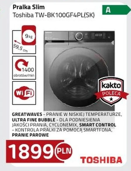 Pralka Slim Toshiba TW-BK100GF4PL(SK) GREATWAVES - PRANIE W NISKIEJ TEMPERATURZE, ULTRA FINE BUBBLE - DLA PODNIESIENIA JAKOŚCI PRANIA, CYCLONEMIX, SMART CONTROL - KONTROLA PRALKI ZA POMOCĄ SMARTFONA, PRANIE PAROWE