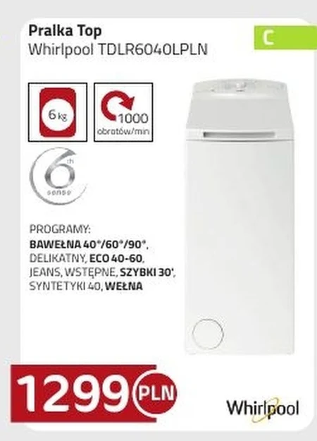 Pralka Top Whirlpool TDLR6040LPLN PROGRAMY: BAWEŁNA 40°/60*/90°. DELIKATNY, ECO 40-60. JEANS, WSTĘPNE, SZYBKI 30', SYNTETYKI 40, WEŁNA