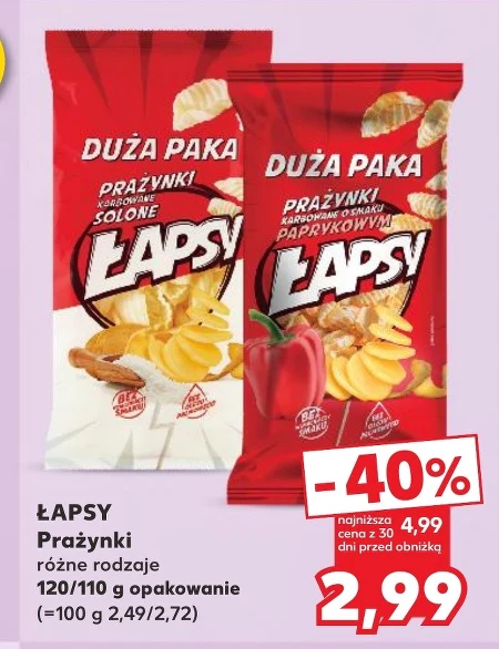 Łapsy Prażynki występują w ofercie Kaufland w cenie 2,99 za opakowanie 120/110 g, z obniżką 40% od najniższej ceny z 30 dni, która wynosiła 4,99. Te chrupiące prażynki to idealna przekąska do podgryzania w ciągu dnia, podczas pracy lub oglądania filmu. Doskonale sprawdzą się jako dodatek do deserów lub samodzielna słodka przyjemność. Skorzystaj z atrakcyjnej promocji i zaoszczędź na ulubionych Łapsach Prażynkach. Oferta ważna od 2026-04-09 do 2026-04-22 Źródło: gazetka Kaufland