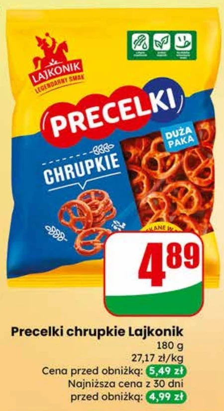 Precelki chrupkie Lajkonik 180 g 27,17 zł/kg Cena przed obniżką: 5,49 zł Najniższa cena z 30 dni przed obniżką: 4,99 zł Chrupkie precelki Lajkonik, dostępne w Dino, to idealna przekąska do chrupania podczas oglądania filmu, czy jako dodatek do wieczornego relaksu. Opakowanie 180g oferowane jest w obniżonej cenie, stanowiąc korzystną alternatywę w porównaniu z cenami z ostatnich 30 dni. Można je spożywać samodzielnie lub podawać z ulubionymi dipami, urozmaicając codzienne menu. Aktualnie kosztują 27,17 zł za kilogram.