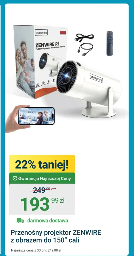 Przenośny projektor ZENWIRE z obrazem do 150” cali Najniższa cena z 30 dni: 249,00 zł