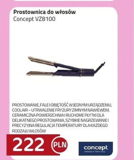 Prostownica do włosów Concept VZ8100 PROSTOWANIE, FALEIOBJĘTOŚĆWJEDNYM URZĄDZENIU, COOLAIR -UTRWALENIE FRYZURY ZIMNYM NAWIEWEM, CERAMICZNA POWIERZCHNIAI RUCHOME PŁYTKIDLA DELIKATNEGO PROSTOWANIA, SZYBKIE NAGRZEWANIEI PRECYZYJNA REGULACJATEMPERATURY DLAKAŻDEGO RODZAJUWŁOSÓW