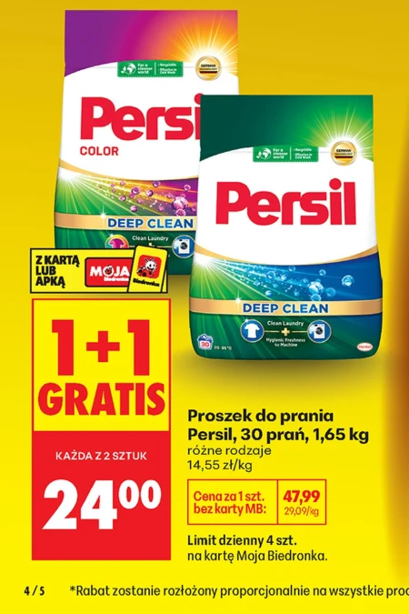 Proszek do prania Persil, 30 prań, 1,65 kg różne rodzaje 14,55 zł/kg Skutecznie usuwa nawet trudne plamy z tkanin, zapewniając doskonałą czystość i świeżość ubrań już od pierwszego prania. Wydajny proszek do prania Persil sprawdzi się zarówno do białych, jak i kolorowych tkanin, dbając o ich intensywny kolor i długotrwałą świeżość. Limit dzienny 4 szt. na kartę Moja Biedronka.