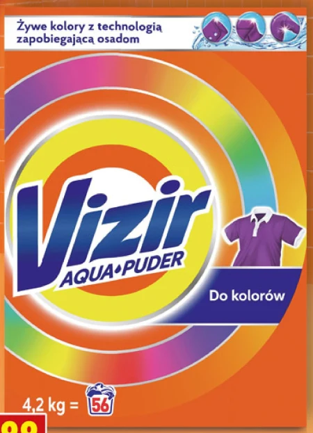 Proszek do prania Vizir AquaPuder Color z technologią zapobiegającą osadom, został stworzony, by zapewnić jeszcze lepsze efekty czyszczenia. Proszek do prania rozpuszcza się w kontakcie z wodą, natychmiast się uaktywniając, aby usunąć wszystkie zabrudzenia i sprawić, że tkaniny zachowają żywe kolory. Powstał, by usuwać zabrudzenia z miejsc, które najtrudniej wyprać, takich jak mankiety, kołnierzyki i pachy, pozostawiając ubrania nieskazitelnie czyste. Używaj razem z płynem do płukania tkanin Lenor, by uzyskać dodatkową miękkość i świeżość.