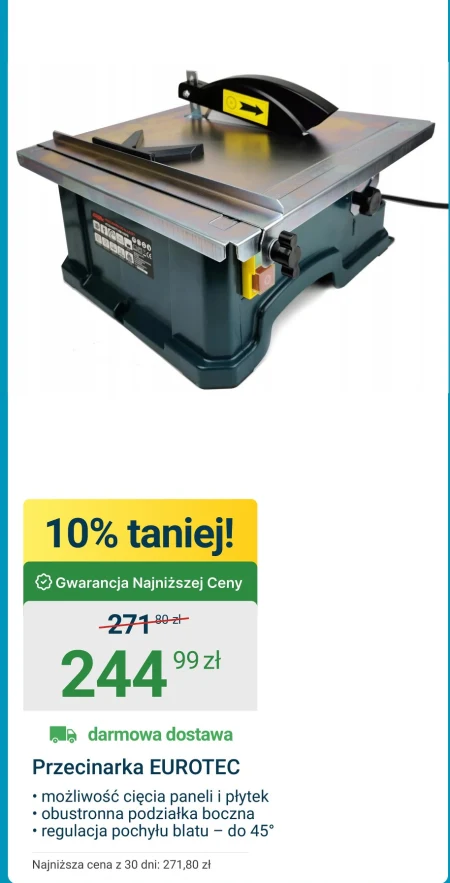 Przecinarka EUROTEC · możliwość cięcia paneli i płytek · obustronna podziałka boczna · regulacja pochyłu blatu - do 45° Najniższa cena z 30 dni: 271,80 zł