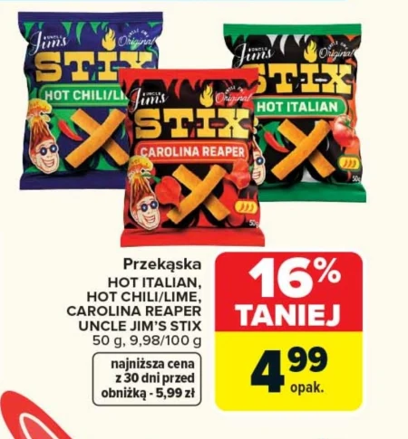 Przekąska HOT ITALIAN, HOT CHILI/LIME, CAROLINA REAPER UNCLE JIM'S STIX 50 g, 9,98/100 g najniższa cena z 30 dni przed obniżką - 5,99 zł