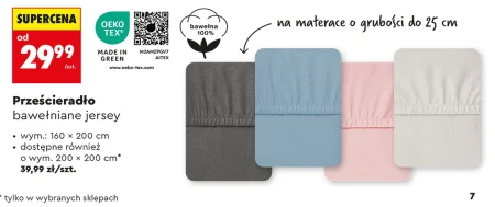 Prześcieradło bawełniane jersey występuje w ofercie Biedronka w super cenie już od 29,99 zł za sztukę. Dostępne są dwa wymiary: 160 x 200 cm oraz 200 x 200 cm*, z czego ten drugi rozmiar może być dostępny tylko w wybranych sklepach. To idealne rozwiązanie dla osób poszukujących wygodnego i miękkiego prześcieradła, pasującego na materace o grubości do 25 cm. Wykonane z wysokiej jakości bawełny, zapewni komfortowy sen i łatwość użytkowania. Warto skorzystać z tej okazji i odświeżyć swoją sypialnię w niskiej cenie. Oferta ważna od 2026-04-11 do 2026-04-29 Źródło: gazetka Biedronka