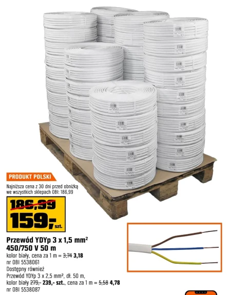 Przewód YDYp 3 x 1,5 mm2 450/750 V 50 m kolor biały, cena za 1 m = 3,74 3,18 nr OBI 5538061