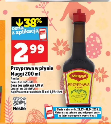 Przyprawa w płynie Maggi 200 ml w sklepie Topaz kosztuje 3,05 zł z aplikacją, co oznacza 38% zniżki w porównaniu do ceny regularnej. To gotowy sos do zup, sosów i mięs, który ułatwia doprawianie potraw bez konieczności używania wielu przypraw. Promocja obowiązuje tylko dla klientów korzystających z aplikacji sklepu, a oferta jest ograniczona czasowo. Sprawdź, czy warto uzupełnić zapasy, zanim cena wróci do poprzedniego poziomu.