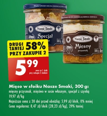 Mięso w słoiku Nasze Smaki, 300 g: mięsny przysmak, mięsiwo w sosie własnym, specjał z szynką 19,97 zł/kg Najniższa cena z 30 dni przed obniżką: 5,99 zł/słoik, 0% mniej Cena regularna: 8,47 zł/słoik (28,23 zł/kg), 29% taniej