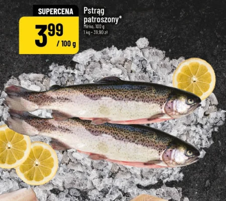 Pstrąg patroszony* Mirko, 100 g 1 kg – 39,90 zł 3,99 / 100 g SUPER CENA Pstrąg patroszony Mirko w atrakcyjnej cenie 3,99 zł za 100 g. Aktualnie w POLOmarket 1 kg kosztuje 39,90 zł, co czyni tę ofertę wyjątkowo korzystną. Świeży pstrąg idealnie nadaje się do smażenia, pieczenia lub grillowania, a dzięki patroszeniu oszczędza czas podczas przygotowywania posiłku. To doskonały wybór dla miłośników ryb i zdrowego odżywiania.