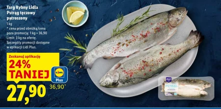 Targ Rybny Lidla Pstrąg tęczowy patroszony 1 kg * cena przed obniżką/cena poza promocją: 1 kg = 36,90 Limit: 3 kg na ofertę. Szczegóły promocji dostępne w aplikacji Lidl Plus.
