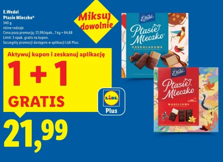 E.Wedel Ptasie Mleczko® 340 g różne rodzaje Cena poza promocją: 21,99/opak., 1 kg = 64,68 Limit: 3 opak. gratis na kupon. Szczegóły promocji dostępne w aplikacji Lidl Plus.