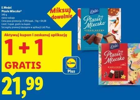 E.Wedel Ptasie Mleczko® 340 g różne rodzaje Cena poza promocją: 21,99/opak., 1 kg = 64,68 Limit: 3 opak. gratis na kupon. Szczegóły promocji dostępne w aplikacji Lidl Plus.