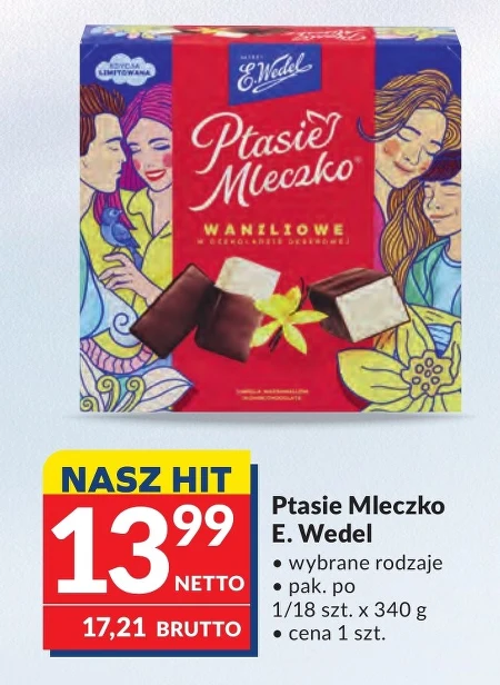 Ptasie Mleczko E. Wedel można kupić w ofercie Makro Cash&Carry w cenie 13,99 netto, co daje 17,21 brutto za opakowanie. Dostępne są wybrane rodzaje tego popularnego słodkiego przysmaku, pakowane po 18 sztuk, a waga jednego opakowania to 340 gramów. Ptasie Mleczko to idealna przekąska na co dzień, doskonała do kawy lub herbaty, a także słodki dodatek do spotkań towarzyskich. Warto skorzystać z tej okazji i zaopatrzyć się w ulubione smaki, póki są dostępne w atrakcyjnej cenie. Oferta ważna od 2026-04-07 do 2026-04-13 Źródło: gazetka Makro Cash&Carry