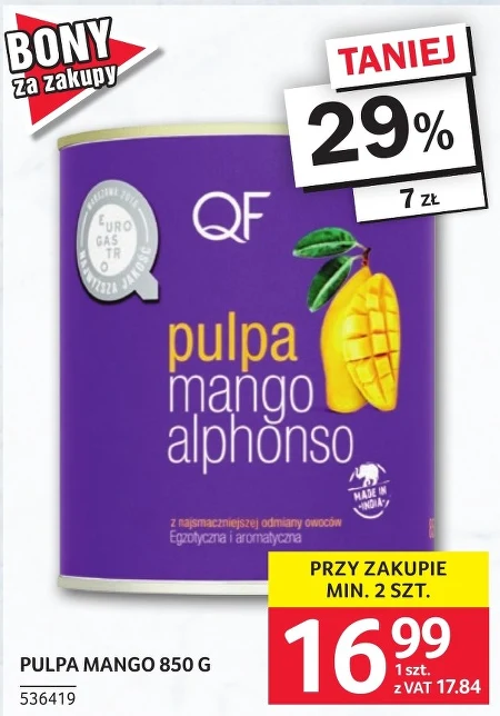 Pulpa mango o gramaturze 850 g dostępna jest w ofercie Selgros Cash&Carry w cenie 17,84 zł za sztukę, przy zakupie minimum dwóch opakowań. Wykonana z najsmaczniejszej odmiany owoców, cechuje się egzotycznym aromatem i smakiem. Doskonale sprawdzi się jako baza do koktajli, deserów, musów, a także jako dodatek do potraw kuchni azjatyckiej lub jako samodzielna, orzeźwiająca przekąska. Warto skorzystać z tej okazji, aby zaopatrzyć się w ten wyjątkowy produkt. Oferta ważna od 2026-04-09 do 2026-04-22 Źródło: gazetka Selgros Cash&Carry
