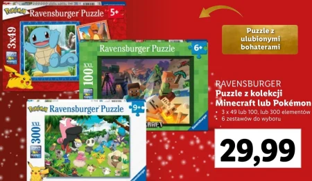 RAVENSBURGER Puzzle z kolekcji Minecraft lub Pokémon 3 x 49 lub 100, lub 300 elementów * 6 zestawów do wyboru