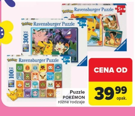 Puzzle POKÉMON różne rodzaje Ravensburger Puzzle 5+ Ravensburger Puzzle 9+ Ravensburger Puzzle 6+ 300 100 CENA OD 39,99 opak. Puzzle Pokémon od Ravensburger dostępne w Carrefour to świetny sposób na rozwijanie zdolności manualnych i logicznego myślenia u dzieci w różnym wieku – modele 5+, 6+ i 9+ zapewniają odpowiedni poziom trudności. Różnorodność wzorów z popularnego świata Pokémon zachęca do kreatywnej zabawy, a ułożone puzzle mogą stać się oryginalną dekoracją pokoju. Aktualnie w Carrefour można znaleźć je w atrakcyjnych cenach, zaczynających się od 39,99 zł za opakowanie.