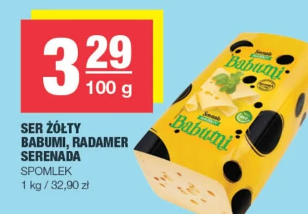 SER ŻÓŁTY BABUMI, RADAMER SERENADA SPOMLEK 1 kg / 32,90 zł Wykorzystaj ten tradycyjny ser żółty, taki jak Babumi, Radamer, Serenada czy Spomlek, do przygotowania pysznych kanapek, zapiekanek i placków ziemniaczanych, dodając wyjątkowy smak i aromat do codziennych posiłków. Doskonały składnik wielu dań kuchni polskiej, stanowi bazę do serowych sosów, gratynów i bezpłatnych przekąsek, zapewniając źródło wapnia i białka w diecie. Ten ser w bloku, o wadze 1 kg, idealnie nadaje się do krojenia w plastry lub tarcia na świeże sałatki, a także jako dodatek do pizzy i innych wypieków, podnosząc ich walory smakowe.