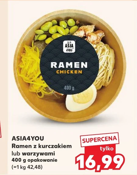 Ramen z kurczakiem lub warzywami ASIA4YOU kupisz w ofercie Kaufland w super cenie 16,99 za opakowanie o wadze 400 g (1 kg 42,48). To szybkie i proste danie, które możesz przygotować w domu, idealne na obiad lub kolację, jeśli masz ochotę na smaki Azji. Wystarczy zalać zawartość opakowania gorącą wodą i cieszyć się aromatycznym posiłkiem z kurczakiem lub bogatą porcją warzyw. Skorzystaj z okazji i zaopatrz się w ten smakowity ramen w atrakcyjnej cenie. Oferta ważna od 2026-04-09 do 2026-04-22 Źródło: gazetka Kaufland