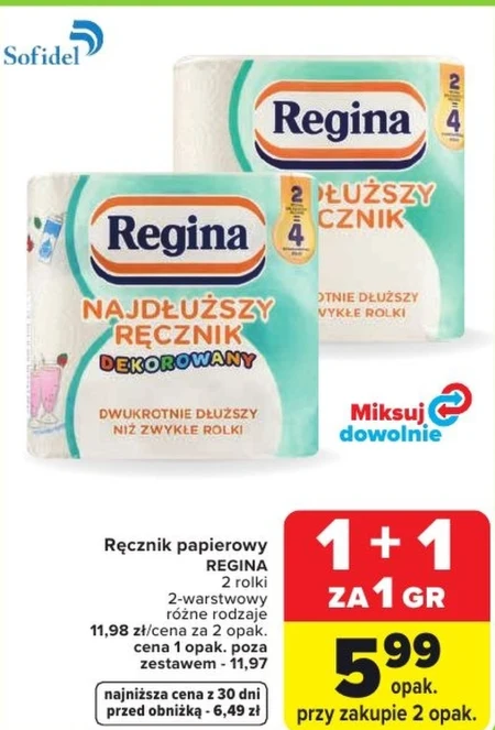 Ręcznik papierowy Regina, dostępny w Carrefour Market, oferowany jest w zestawie dwóch rolek w cenie 11,98 zł. Obecnie można go nabyć w promocji 1 + 1 za 1 gr, co oznacza, że opakowanie kosztuje 5,99 zł przy zakupie dwóch sztuk. Cena pojedynczego opakowania poza promocją to 11,97 zł, natomiast najniższa cena z ostatnich 30 dni wynosiła 6,49 zł. Dw warstwowy papier zapewnia solidną chłonność i jest niezastąpiony w każdym gospodarstwie domowym – idealny do sprzątania, osuszania rąk czy wycierania powierzchni. Warto skorzystać z tej okazji i zaopatrzyć się w praktyczny ręcznik papierowy w atrakcyjnej cenie.