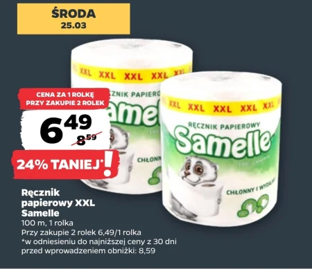 Ręcznik papierowy XXL Samelle w Netto kosztuje 6,49 zł za 1 rolkę przy zakupie dwóch rolek, co oznacza 24% obniżki względem ceny sprzed 30 dni. Rolka zawiera 100 metrów ręcznika. Ten wytrzymały ręcznik papierowy idealnie sprawdzi się do sprzątania w kuchni, łazience czy podczas codziennych porządków. Promocja obowiązuje w Netto.