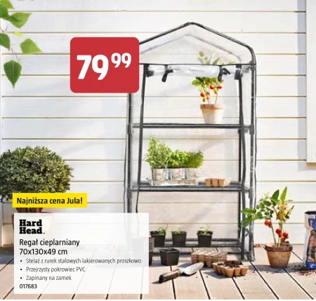 Regał ciepłarniany Hard Head o wymiarach 70x130x49 cm to idealne rozwiązanie dla każdego ogrodnika, który chce przedłużyć sezon wegetacyjny. Solidny stelaż wykonany z malowanych proszkowo rurek stalowych gwarantuje stabilność konstrukcji, a przejrzysty pokrowiec z PVC zapewnia dostęp światła. Zamek umożliwia łatwy dostęp do roślin i utrzymanie odpowiedniej temperatury – ten regał dostępny jest w Jula w najniższej cenie.