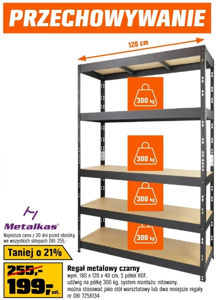 Regał metalowy czarny wym. 180 x 120 x 40 cm, 5 półek HDF, udźwig na półkę 300 kg, system montażu: nitowany, można stosować jako stół warsztatowy lub dwa mniejsze regały nr OBI 7256134