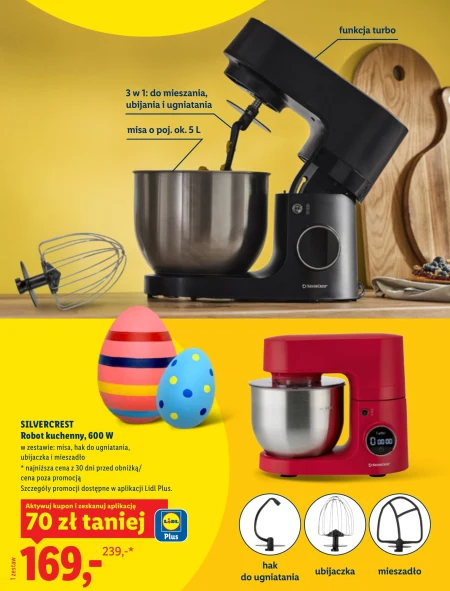 SILVERCREST Robot kuchenny 600 W dostępny jest w Lidlu w promocji za 169 zł, co stanowi 70 zł taniej dzięki aktywacji kuponu w aplikacji Lidl Plus, podczas gdy cena regularna wynosi 239 zł. W zestawie znajduje się misa, hak do ugniatania, ubijaczka i mieszadło. Robot kuchenny ten pozwoli na efektywne przygotowywanie ciast, kremów i innych potraw, oszczędzając Twój czas i siłę. Aktualna oferta to najniższa cena z ostatnich 30 dni.