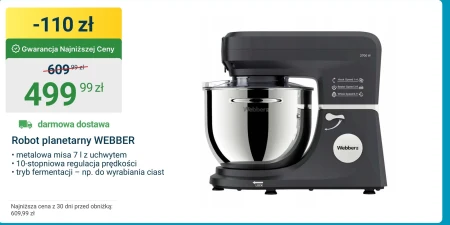 Robot planetarny WEBBER · metalowa misa 7 I z uchwytem · 10-stopniowa regulacja prędkości · tryb fermentacji - np. do wyrabiania ciast Najniższa cena z 30 dni przed obniżką: 609,99 zł