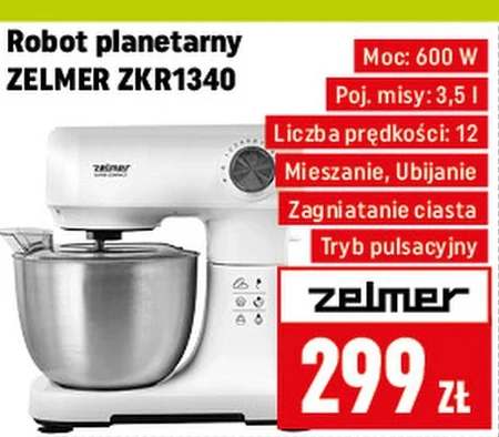 Robot planetarny ZELMER ZKR1340 Moc: 600 W Poj. misy: 3,5 l Liczba prędkości: 12 Mieszanie, Ubijanie Zagniatanie ciasta Tryb pulsacyjny
