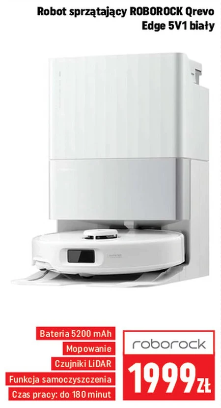 Robot sprzątający ROBOROCK Qrevo Edge 5V1 biały dostępny jest w Neopunkcie w cenie 1999 zł. Model ten wyposażony w baterię 5200 mAh zapewnia do 180 minut pracy, a funkcja mopowania i czujniki LiDAR gwarantują dokładne sprzątanie. Dzięki funkcji samoczyszczenia, obsługa urządzenia jest jeszcze wygodniejsza, a robot idealnie sprawdzi się do utrzymania czystości w domu bez Twojego udziału.