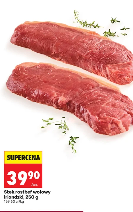Irlandzki stek rostbef wołowy o wadze 250 g dostępny jest w atrakcyjnej cenie 39,90 zł, co daje 159,60 zł za kilogram. Aktualna gazetka Biedronki wyróżnia ten stek jako produkt w SUPER CENIE, idealny do przygotowania wykwintnego obiadu lub kolacji. Można go wykorzystać do przygotowania klasycznego steku, tatara lub innych potraw z wołowiny.