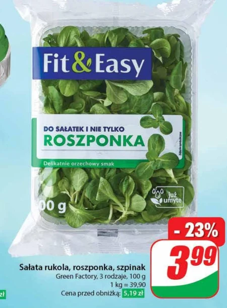 Sałata rukola, roszponka, szpinak Green Factory, 3 rodzaje, 100 g 1 kg = 39,90 Cena przed obniżką: 5,19 zł