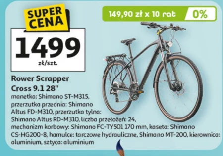 Rower Scrapper Cross 9.1 28" manetka: Shimano ST-M315, przerzutka przednia: Shimano Altus FD-M310, przerzutka tylna: Shimano Altus RD-M310, liczba przełożeń: 24, mechanizm korbowy: Shimano FC-TY501 170 mm, kaseta: Shimano CS-HG200-8, hamulce: tarczowe hydrauliczne, Shimano MT-200, kierownica: aluminium, sztyca: aluminium