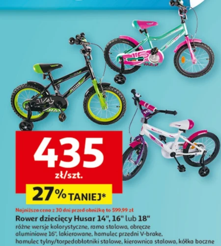 Rower dziecięcy Husar 14", 16" lub 18" różne wersje kolorystyczne, rama stalowa, obręcze aluminiowe 16", lakierowane, hamulec przedni V-brake, hamulec tylny/torpedoblotniki stalowe, kierownica stalowa, kółka boczne Idealny **rower dla dziecka** Husar w rozmiarach 14, 16 lub 18 cali to gwarancja bezpiecznej i radosnej **nauki jazdy na rowerze**, dzięki dodatkowym **kółkom bocznym** i niezawodnemu **hamulcowi V-brake**. Wytrzymała **stalowa rama** i **aluminiowe obręcze** zapewniają trwałość, a różnorodność **kolorów rowerów dziecięcych** pozwoli dopasować go do indywidualnych preferencji małego rowerzysty. Ten **rower** to doskonały wybór dla początkujących cyklistów, zachęcający do aktywnego spędzania czasu na świeżym powietrzu i rozwijania sprawności fizycznej.