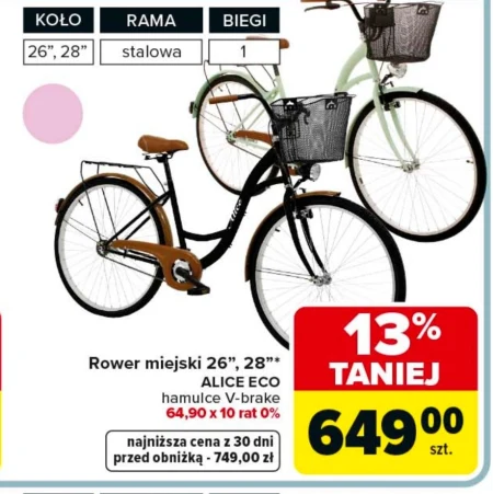 Rower miejski 26", 28"* ALICE ECO hamulce V-brake 64,90 x 10 rat 0% najniższa cena z 30 dni przed obniżką - 749,00 zł