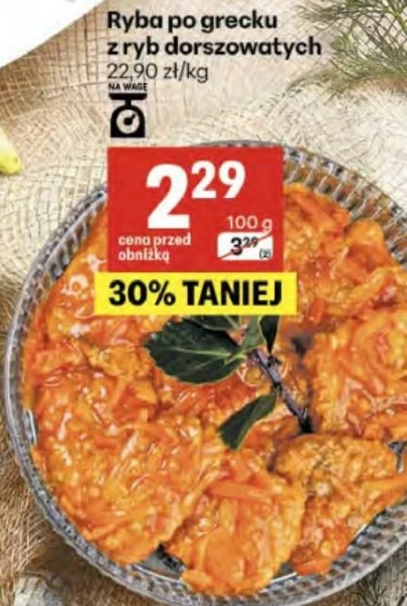 Ryba po grecku jest dostępna w ofercie Delikatesy Centrum w cenie 22,90 zł za kilogram, co daje 2,29 zł za 100 gramów. Aktualnie produkt jest przeceniony o 30% z ceny 3,29 zł. Ta tradycyjna przekąska przygotowywana jest z dorsza, oferując wyrazisty smak marynaty greckiej, idealną jako dodatek do pieczywa lub samodzielne danie. Warto skorzystać z tej okazji i zaopatrzyć się w ten popularny produkt w korzystnej cenie. Ważność: 2026-04-02 – 2026-04-08 Źródło: gazetka Delikatesy Centrum