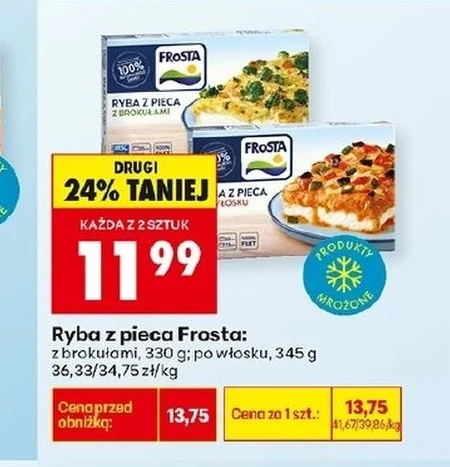 Ryba z pieca występuje w ofercie Biedronka w cenie 13,75 zł za sztukę, co daje 33/34,75 zł za kilogram. Kupując każdą z dwóch sztuk, zapłacisz tylko 11,99 zł, czyli 24% taniej. Dostępne smaki to ryba z brokułami o wadze 330 g oraz po włosku, waga 345 g. To propozycja dla osób szukających szybkiego i łatwego w przygotowaniu posiłku, idealnego na obiad lub kolację. Oferta ważna od 2026-04-07 do 2026-04-11 Źródło: gazetka Biedronka