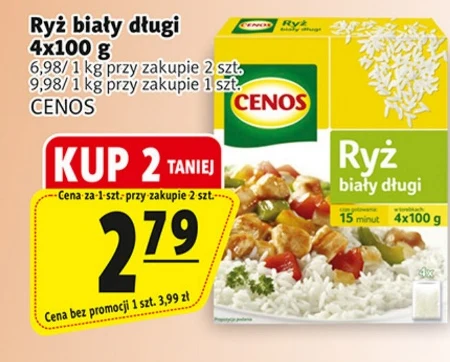Ryż biały długi 4x100 g 6,98/ 1 kg przy zakupie 2 szt. 9,98/ 1 kg przy zakupie 1 szt. CENOS