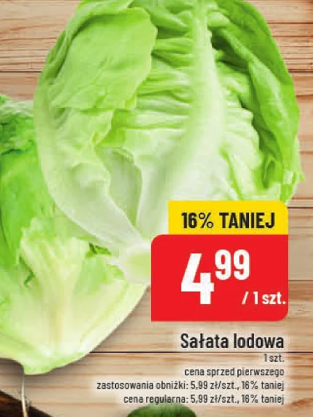 Sałata lodowa 1 szt. cena sprzed pierwszego zastosowania obniżki: 5,99 zł/szt., 16% taniej cena regularna: 5,99 zł/szt., 16% taniej Świeża sałata lodowa to doskonały składnik zdrowych sałatek, idealna do przygotowania lekkich dań i diet niskokalorycznych. Jej chrupiąca konsystencja i delikatny smak sprawiają, że doskonale komponuje się z różnymi sosami i dodatkami, dodając świeżości każdej kompozycji kulinarnej. Wykorzystaj ją do przygotowania zdrowych wrapów, kanapek lub jako dodatek do dań głównych, bogatych w witaminy i minerały.
