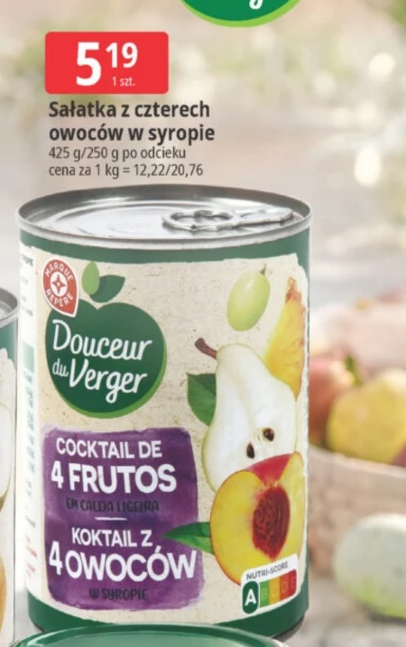 Sałatka z czterech owoców w syropie E.Leclerc kosztuje 5,19 za opakowanie. Produkt ma wagę 425 g, a po odcedzeniu 250 g, co daje cenę za kilogram na poziomie 12,22 lub 20,76 w zależności od wagi. To gotowy deser lub dodatek do innych potraw, idealny na szybką przekąskę lub słodkie podsumowanie posiłku. Sałatka zawiera mieszankę różnych owoców w słodkim syropie, zamkniętą w wygodnym opakowaniu. Skorzystaj z tej oferty i zaopatrz się w smaczny deser w atrakcyjnej cenie.