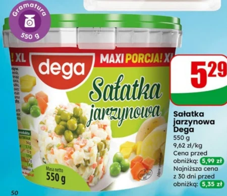 Sałatka jarzynowa Dega 550 g 9,62 zł/kg Cena przed obniżką: 5,99 zł Najniższa cena z 30 dni przed obniżką: 5,35 zł