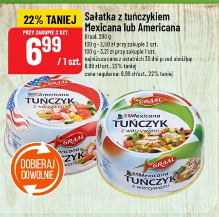 Sałatka z tuńczykiem Mexicana lub Americana Graal. 280 g 100 g - 2,50 zł przy zakupie 2 szt. 100 g - 3,21 zł przy zakupie 1 szt. najniższa cena z ostatnich 30 dni przed obniżką: 8,99 zł/szt., 22% taniej cena regularna: 8,99 zł/szt., 22% taniej