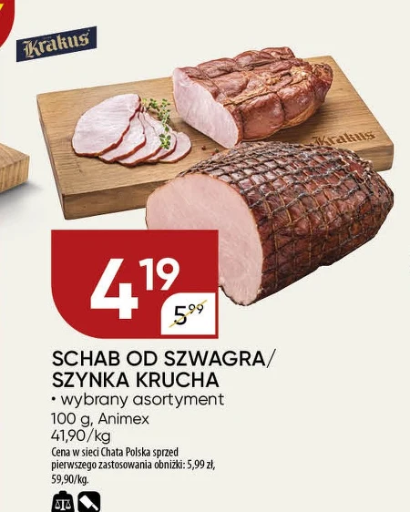 SCHAB OD SZWAGRA/ SZYNKA KRUCHA · wybrany asortyment 100 g, Animex 41,90/kg Cena w sieci Chata Polska sprzed pierwszego zastosowania obniżki: 5,99 zł, 59,90/kg.