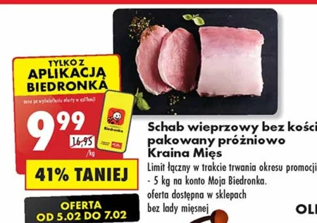 Schab wieprzowy bez kości pakowany próżniowo Kraina Mięs Limit łączny w trakcie trwania okresu promocji - 5 kg na konto Moja Biedronka. oferta dostępna w sklepach bez lady mięsnej