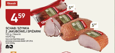 SCHAB/SZYNKA Z JAKUBOWEJ SPIŻARNI 100 g, Olewnik 45,90/kg Cena w sieci Chata Polska sprzed pierwszego zastosowania obniżki: 5,89-5,99 zł, 58,90-59,90/kg.
