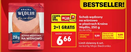 Kraina Wiśniowo na śliwkowo w plastrach występuje w ofercie Biedronka w cenie 26,64 zł za kilogram, w opakowaniu 250 g. Kupując dwie sztuki, trzecią otrzymasz gratis. Każda z trzech sztuk kosztuje 6,66 zł. Obecnie cena produktu z kartą Moja Biedronka wynosi 9,99 zł, jednak cena bez karty jest wyższa i została skreślona. To idealna przekąska dla osób lubiących słodki smak śliwek zamknięty w delikatnych plasterkach. Produkt świetnie sprawdzi się jako dodatek do deserów, ciast lub po prostu jako słodka chwila w ciągu dnia. Warto skorzystać z tej okazji, ponieważ promocja 2+1 gratis pozwala zaoszczędzić. Pamiętaj, że limit dzienny na kartę Moja Biedronka wynosi 6 sztuk. Oferta ważna od 2026-04-13 do 2026-04-18 Źródło: gazetka Biedronka