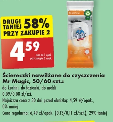 Ściereczki nawilżane do czyszczenia Mr Magic, 50/60 szt.: do kuchni, do łazienki, do mebli 0,09/0,08 zł/szt. Najniższa cena z 30 dni przed obniżką: 4,59 zł/opak., 0% mniej Cena regularna: 6,49 zł/opak. (0,13/0,11 zł/szt.), 29% taniej