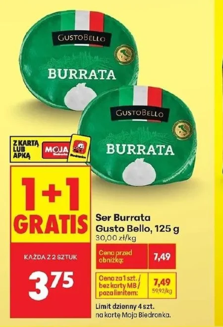 Ser Burrata Gusto Bello, 125 g 30,00 zł/kg Cena przed obniżką: 7,49 Cena za 1 szt. / bez karty MB / poza limitem: 7,49 59,92/kg Limit dzienny 4 szt. na kartę Moja Biedronka.